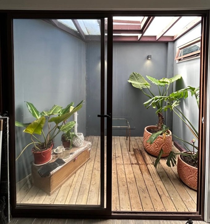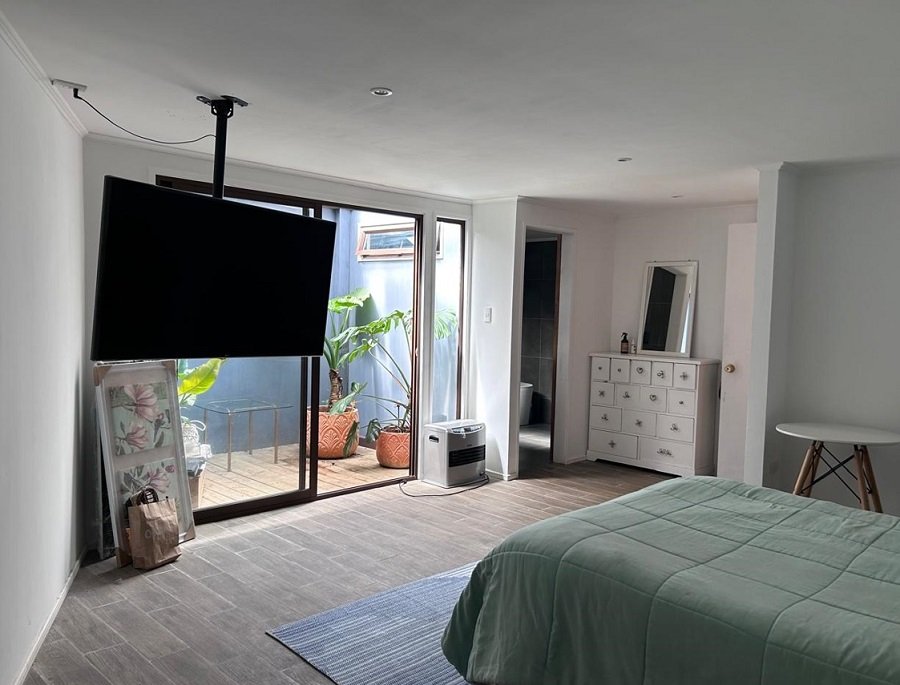 Espacioso dormitorio principal con piso de porcelanato, que cuenta con un área de vestidor, baño privado con shower door y un acogedor patio interior privado.